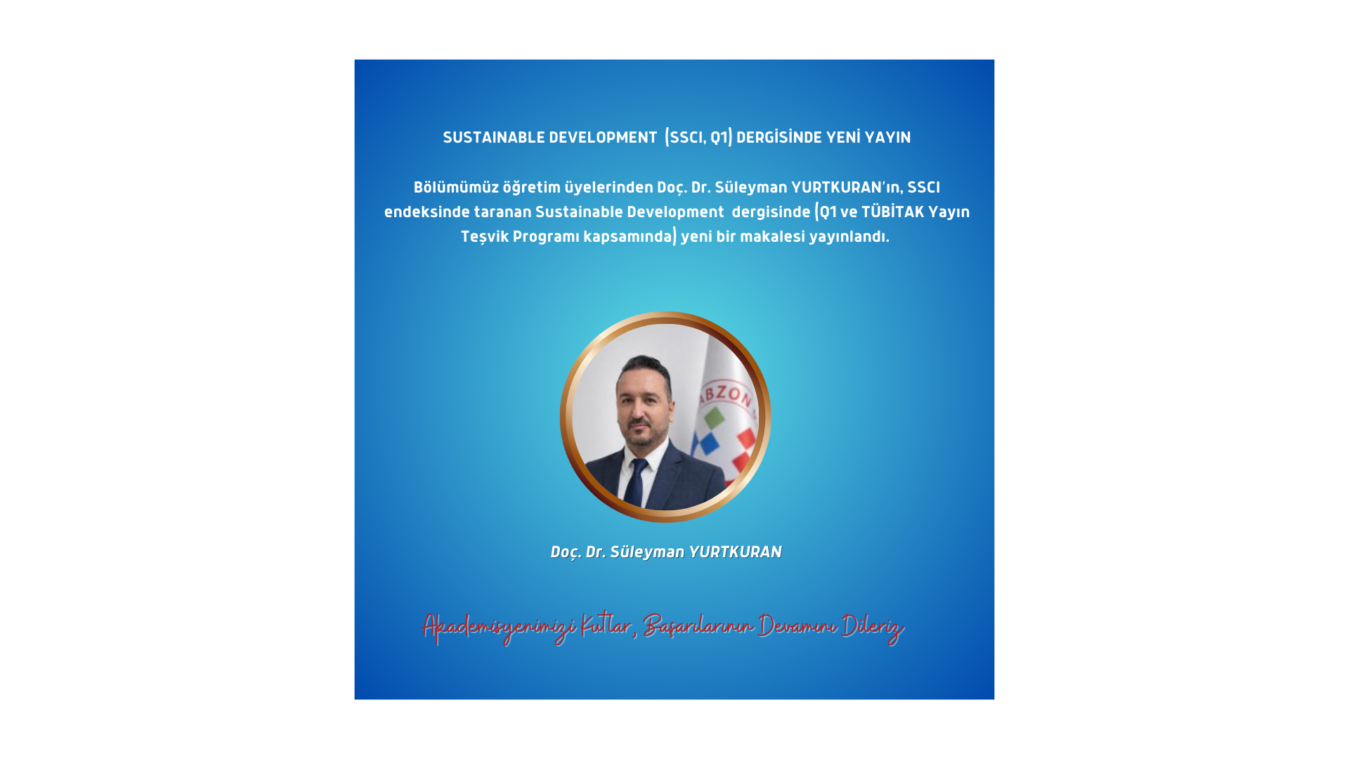 Bölümümüzün öğretim üyelerinden Doç. Dr. Süleyman YURTKURAN’ın, SSCI endeksinde taranan Sustainable Development dergisinde (Q1 ve TÜBİTAK Yayın Teşvik Programı kapsamında) yeni bir makalesi yayınlandı.